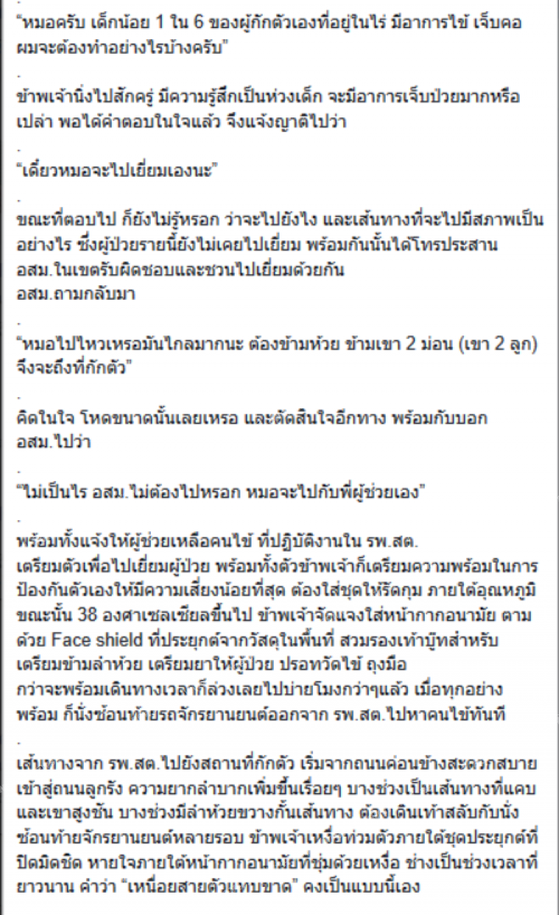 หมอครับ เด็กน้อย 1 ใน 6 ของผู้กักตัวเองที่อยู่ในไร่ มีอาการ ผมจะต้องทำอย่างไรบ้างครับ ข้าพเจ้านิ่งไปสักครู่ มีความรู้สึกเป็นห่วงเด็ก จะมีอาการเจ็บป่วยมากหรือเปล่า พอได้คำตอบในใจแล้ว จึงแจ้งญาติไปว่า เดี๋ยวหมอจะไปเยี่ยมเองนะ ขณะที่ตอบไป ก็ยังไม่รู้หรอก ว่าจะไปยังไง และเส้นทางที่จะไปมีสภาพเป็นอย่างไร ซึ่งผู้ป่วยรายนี้ยังไม่เคยไปเยี่ยม พร้อมกันนั้นได้โทรประสาน อสม.ในเขตรับผิดชอบและชวนไปเยี่ยมด้วยกัน อสม.ถามกลับมา