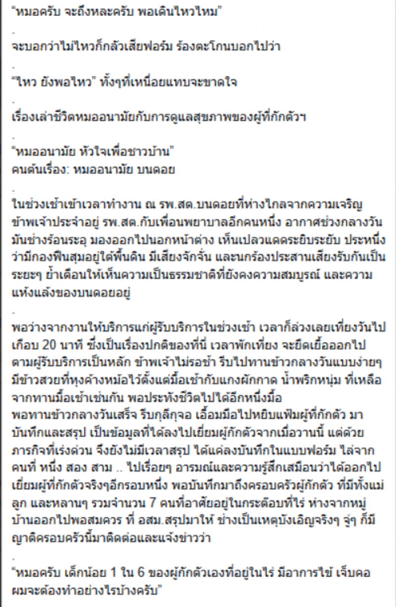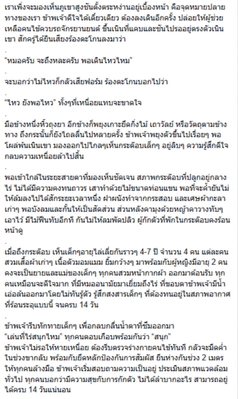 ข้าพเจ้ารีบทักทายเด็กๆ เพื่อกลบกลื่นน้ำตาที่ซึมออกมา เล่นที่ไร่สนุกไหม ทุกคนตอบเกือบพร้อมกันว่า สนุก ข้าพเจ้าไม่รอให้หายเหนื่อย ต้องรีบตรวจร่างกายคนไข้ทันที กลัวจะมืดค่ำในช่วงขากลับ พร้อมกับยึดหลักป้องกันการสัมผัส ยืนห่างกันช่วง 2 เมตร ให้ทุกคนล้างมือ ข้าพเจ้าเริ่มสอบถามความเป็นอยู่ ประเมินสภาพแวดล้อมทั่วไป ทุกคนบอกว่ามีความสุขกับการกักตัว ไม่ได้ลำบากอะไร สามารถอยู่ได้ครบ 14 วันแน่นอน